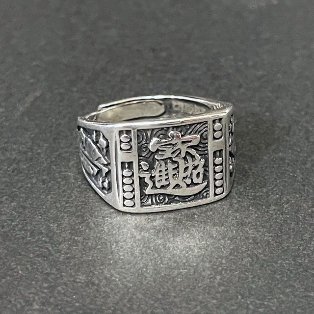 縁起の良い合体漢字が刻まれた印台のリング。 吉祥文字の招財進寶 (しょうざいしんぽう)いう漢字を組み合わせた文字で、宝船に宝物を積んだ姿を表しています。 招財進寶 (しょうざいしんぽう)とは 『財を招き宝が入ってくる』 『財運を高めて思うがままに幸運を手に入れる事が出来る』で、 財運や縁起物にと人々の夢を叶えてくれる金運・財運のシンボル とも言われています。 【サイズ】18号 調整可能 【素材】ステンレス ※アンティーク調に仕上げているため、リングに黒ずみや歪み等がございます。 汚れやサビではございませんので予めご了承ください。