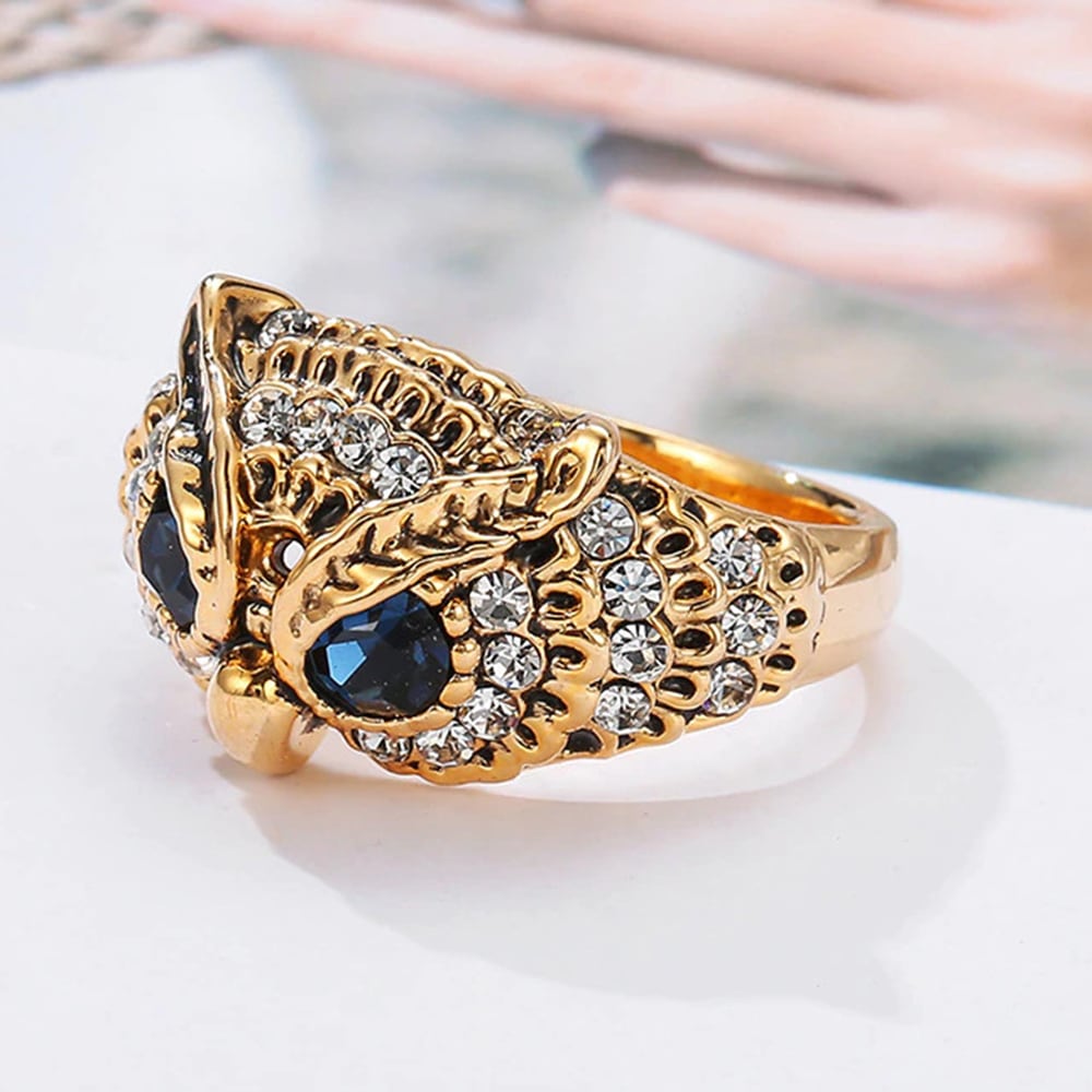 リング 指輪 梟 ジルコニア ゴールド ブルーアイ ふくろう フクロウ 不苦労 お守り 動物 CZ CZダイヤ きらきら レディース