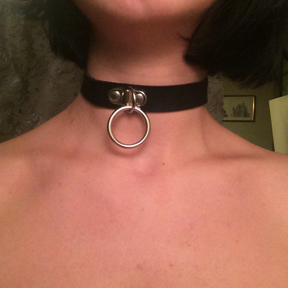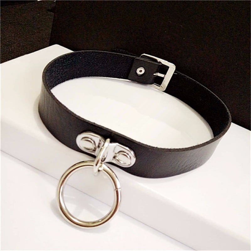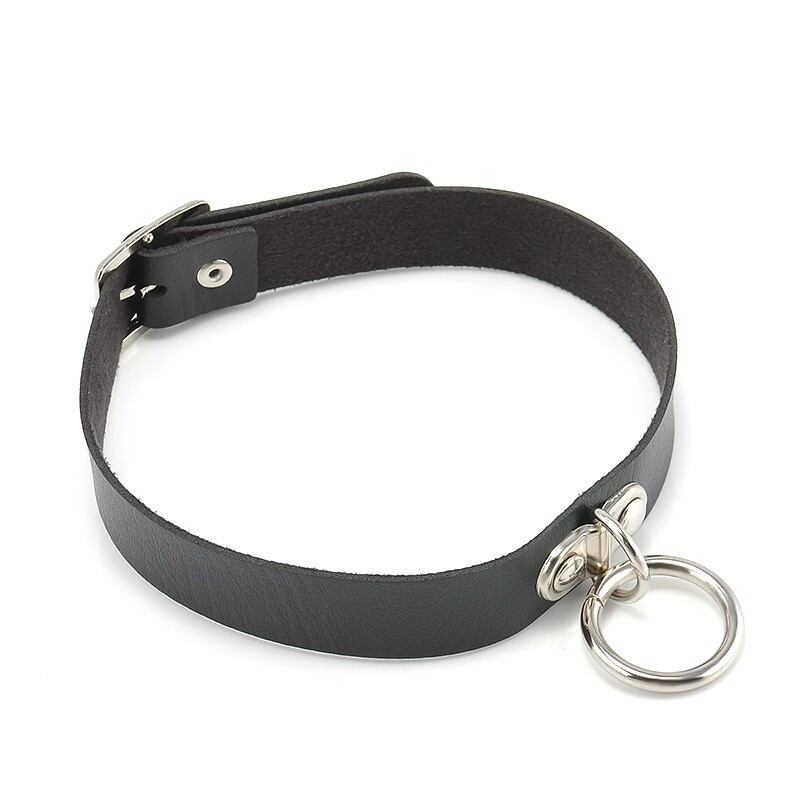 太幅のレザーチョーカーに、フロントのプレートに大きなリングが可愛い