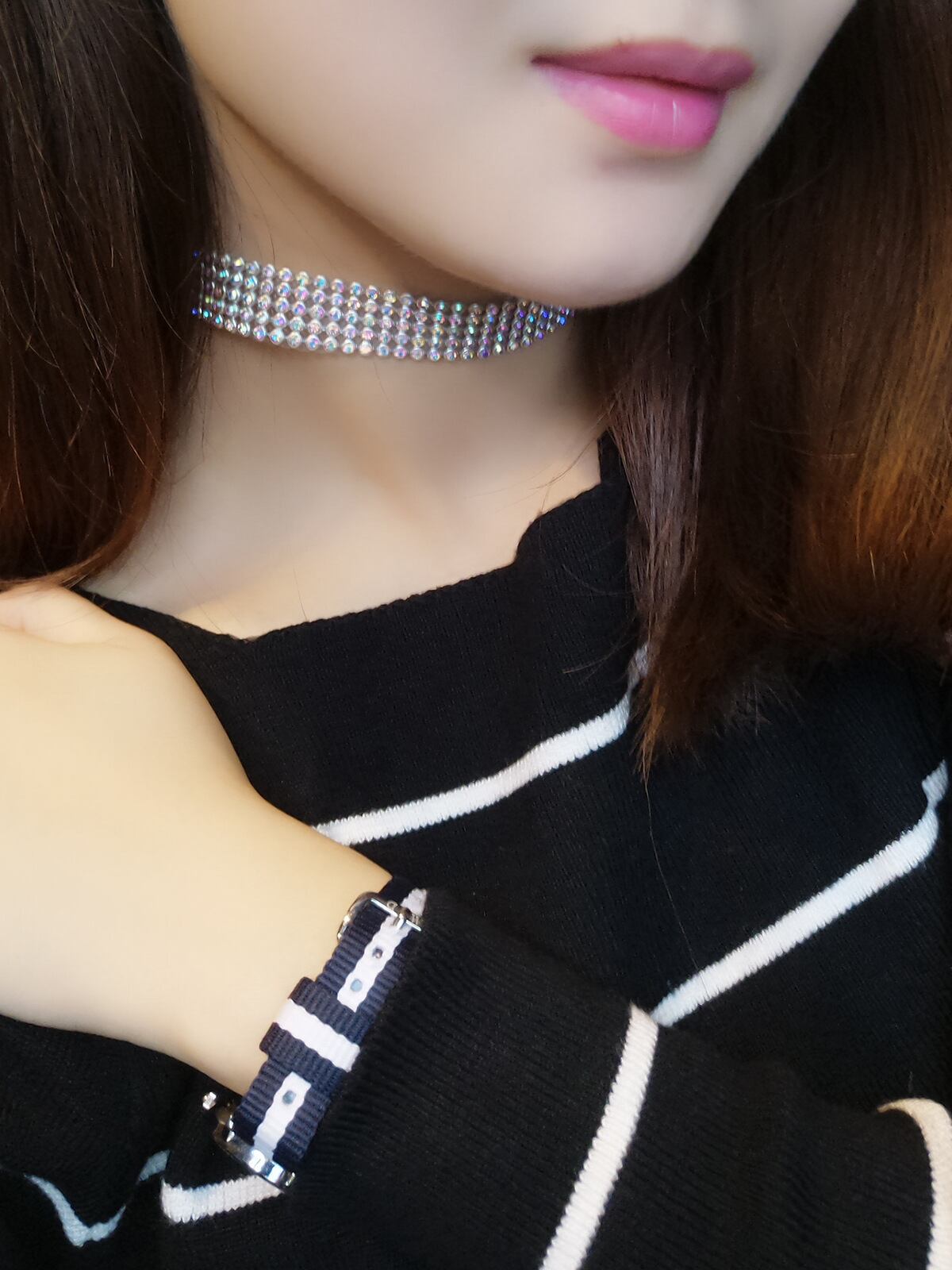 甘辛MIXコーデ、原宿系ファッション、病みかわいい、首輪女子、パンク、ゴスロリ、ロリータ、ゴシック、ゆめかわ、やみかわ、首輪、ラインストーン、ストーン、チョーカー、ネックレス、シルバー、コスプレ、結婚式、ライブ、フェス、パーティ